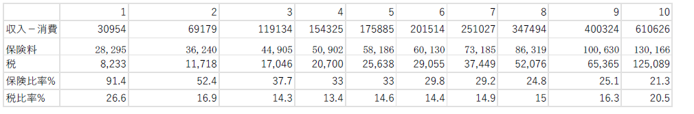重要なのは、第1階層の保険料がSの大部分を占め、保険比率が全階層中、最高である点です。同階層のSは、第10階層の5.1%(30954÷610626)に過ぎません。Sは、格差の大きい勤め先収入から、より均等な消費支出を引いた値だからです。他方、第1階層の保険料は第10階層の保険料の21.7% で、Sより均等な分布です。