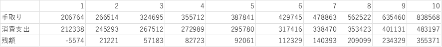 残額は手取り-消費支出で、第1階層だけがマイナスです。同階層は、勤め先収入の手取りでは消費支出を賄えません。