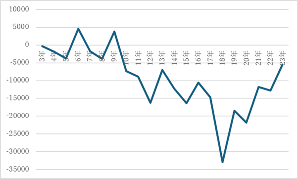図は、2003年から2023年における第1階層の(手取り-消費支出)の推移を示します。縦軸の0は、手取り=消費支出を表します。